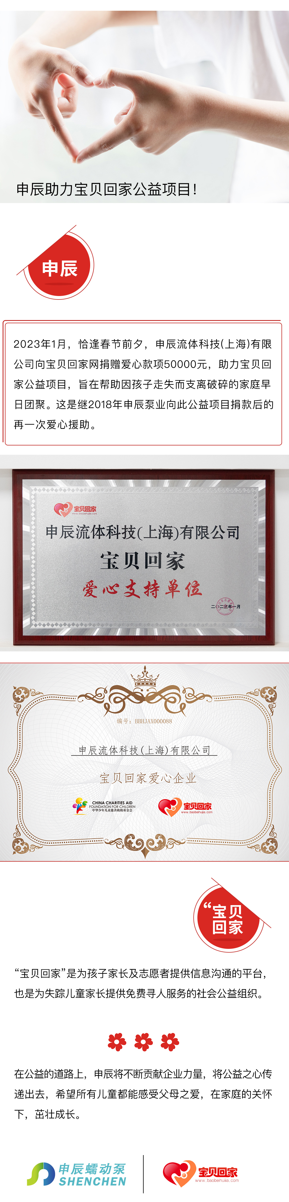 2023年1月,恰逢春節(jié)前夕,申辰流體科技(上海)有限公司向寶貝回家網(wǎng)捐贈愛心款項50000元,助力寶貝回家公益項目,旨在幫助因孩子走失而支離破碎的家庭早日團聚。這是繼2018年申辰泵業(yè)向此公益項目捐款后的再一次愛心援助。