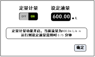 點(diǎn)擊定量計(jì)量按鈕,設(shè)為ON時(shí)開(kāi)啟此功能,點(diǎn)擊設(shè)定液量,錄入設(shè)定液量,單位可以選擇為mL或者L,范圍0.01mL到9999L,提示框顯示在設(shè)定流量下,達(dá)到設(shè)定液量需用時(shí)間。用時(shí)上限為9999min,超過(guò)9999min,系統(tǒng)將警告提醒。