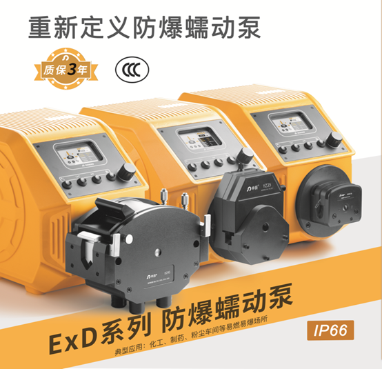 申辰ExD系列防爆蠕動(dòng)泵,是基于防爆標(biāo)準(zhǔn)打造的全新蠕動(dòng)泵品類,同時(shí)達(dá)到Ex db IIC T4 Gb和Ex tb IIIC T130°C Db防爆等級,防護(hù)等級IP66,廣泛應(yīng)用于化工生產(chǎn)、石油、環(huán)保、食品與飲料等領(lǐng)域,為用戶安全生產(chǎn)保駕護(hù)航。