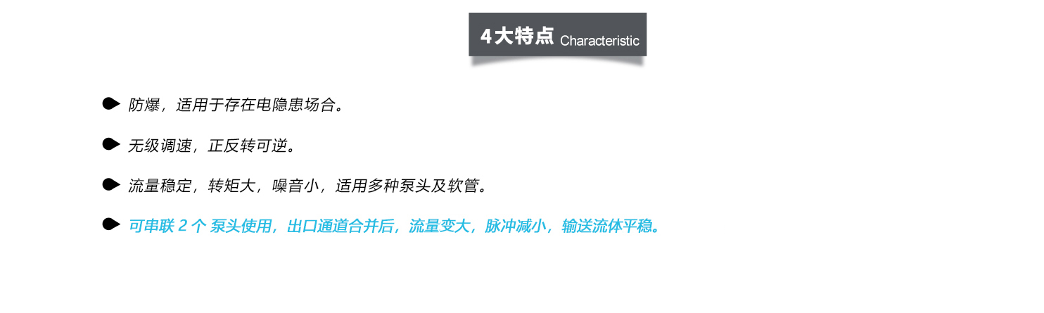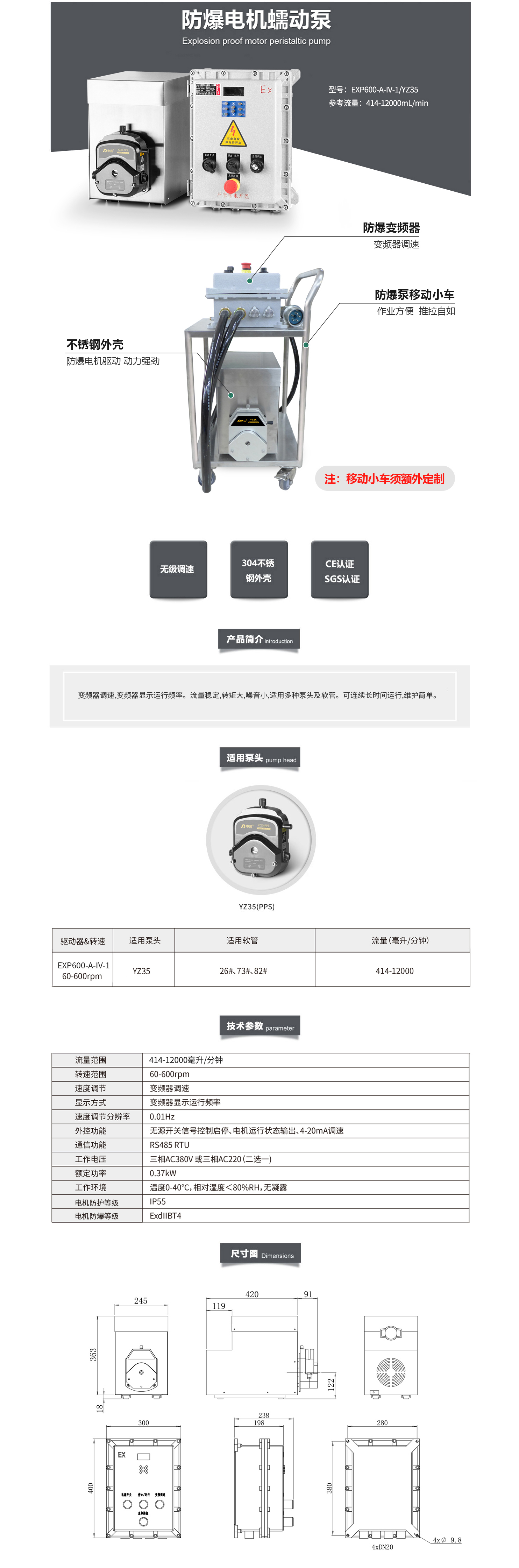 EXP600防爆型蠕動泵 采用防爆電機驅(qū)動 正反轉(zhuǎn)可逆 轉(zhuǎn)速可手動調(diào)節(jié) 流量穩(wěn)定 轉(zhuǎn)矩大 噪音小 適用多種泵頭及軟管 可連續(xù)長時間運行