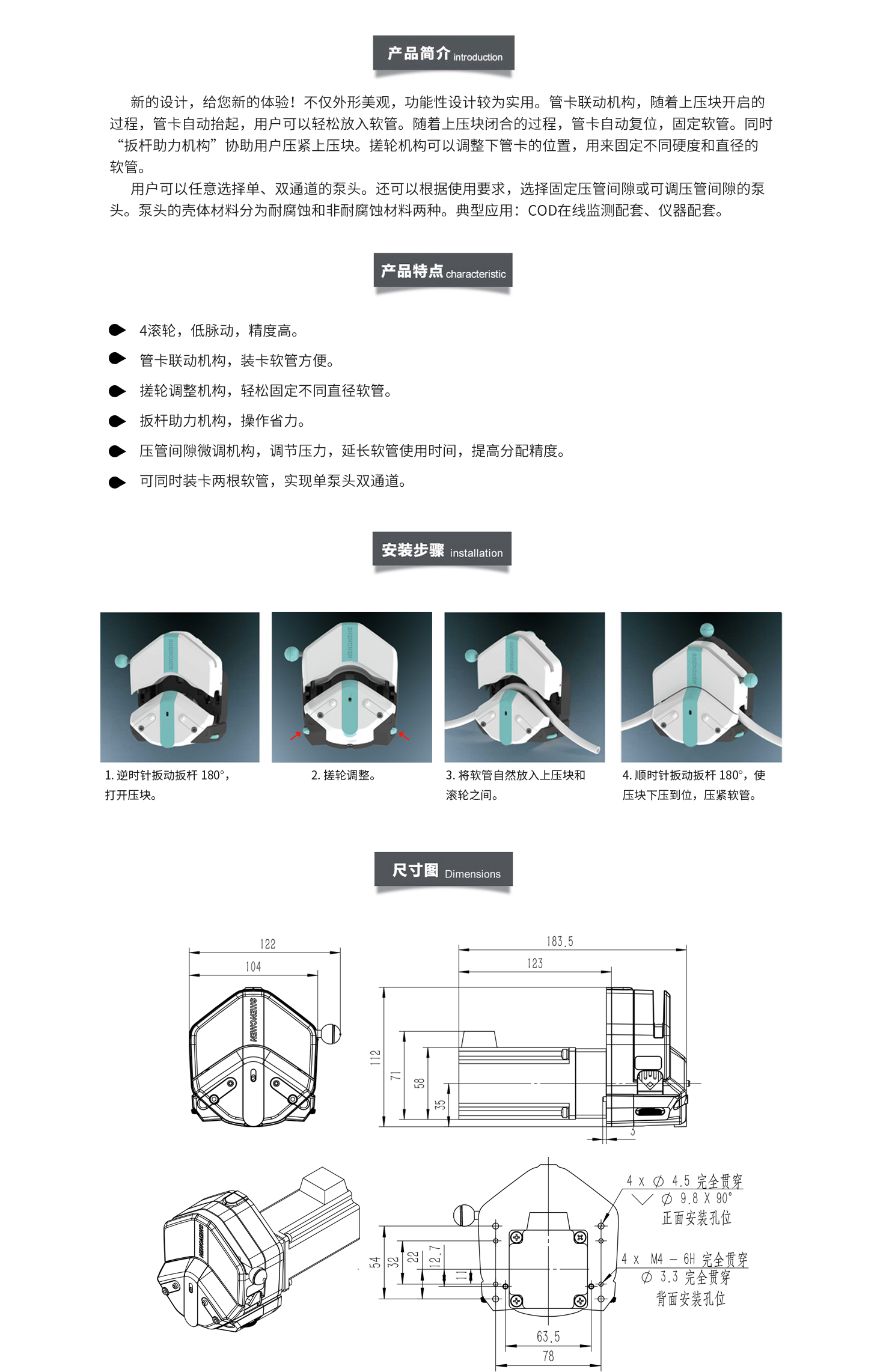 新的設(shè)計(jì),給您新的體驗(yàn)!不僅外形美觀,功能性設(shè)計(jì)較為實(shí)用。管卡聯(lián)動(dòng)機(jī)構(gòu),隨著上壓塊開(kāi)啟的 過(guò)程,管卡自動(dòng)抬起,用戶可以輕松放入軟管。隨著上壓塊閉合的過(guò)程,管卡自動(dòng)復(fù)位,固定軟管。同時(shí)“扳桿助力機(jī)構(gòu)”協(xié)助用戶壓緊上壓塊。搓輪機(jī)構(gòu)可以調(diào)整下管卡的位置,用來(lái)固定不同硬度和直徑的 軟管。 用戶可以任意選擇單、雙通道的泵頭。還可以根據(jù)使用要求,選擇固定壓管間隙或可調(diào)壓管間隙的泵頭。泵頭的殼體材料分為耐腐蝕和非耐腐蝕材料兩種。典型應(yīng)用:COD在線監(jiān)測(cè)配套、儀器配套。