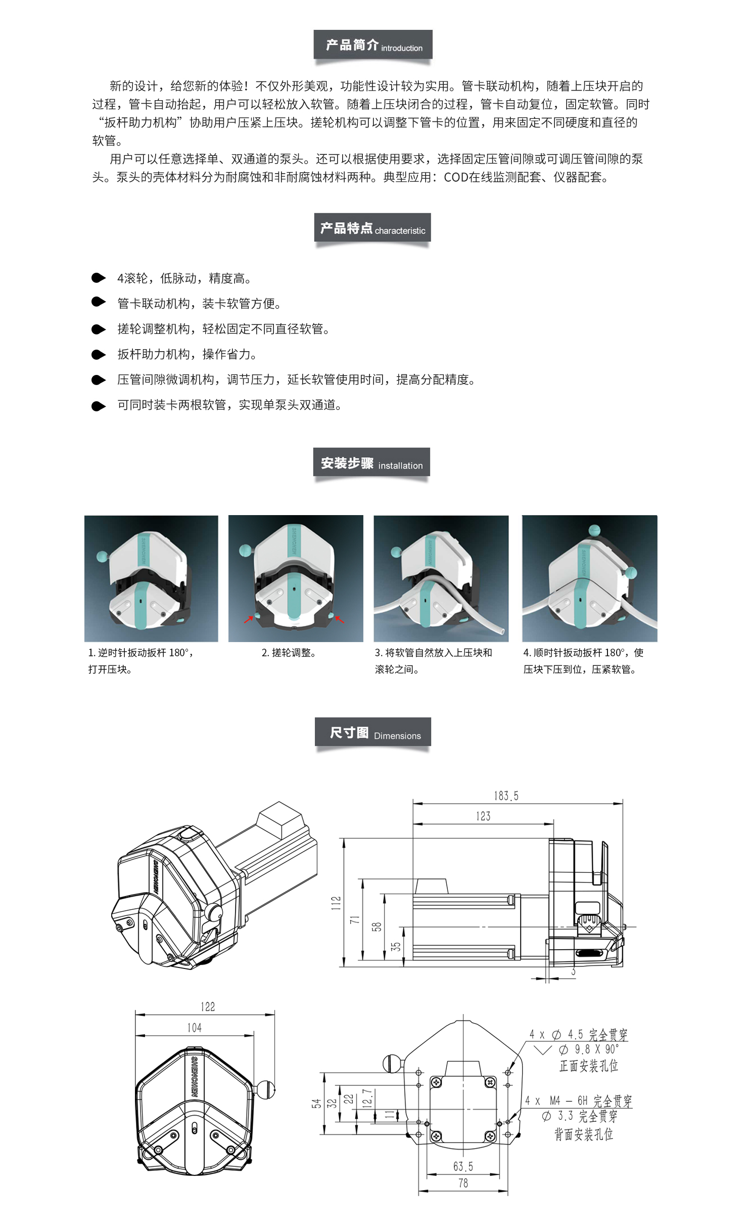 新的設(shè)計(jì),給您新的體驗(yàn)!不僅外形美觀,功能性設(shè)計(jì)較為實(shí)用。管卡聯(lián)動(dòng)機(jī)構(gòu),隨著上壓塊開啟的 過程,管卡自動(dòng)抬起,用戶可以輕松放入軟管。隨著上壓塊閉合的過程,管卡自動(dòng)復(fù)位,固定軟管。同時(shí)“扳桿助力機(jī)構(gòu)”協(xié)助用戶壓緊上壓塊。搓輪機(jī)構(gòu)可以調(diào)整下管卡的位置,用來固定不同硬度和直徑的 軟管。 用戶可以任意選擇單、雙通道的泵頭。還可以根據(jù)使用要求,選擇固定壓管間隙或可調(diào)壓管間隙的泵頭。泵頭的殼體材料分為耐腐蝕和非耐腐蝕材料兩種。典型應(yīng)用:COD在線監(jiān)測配套、儀器配套。