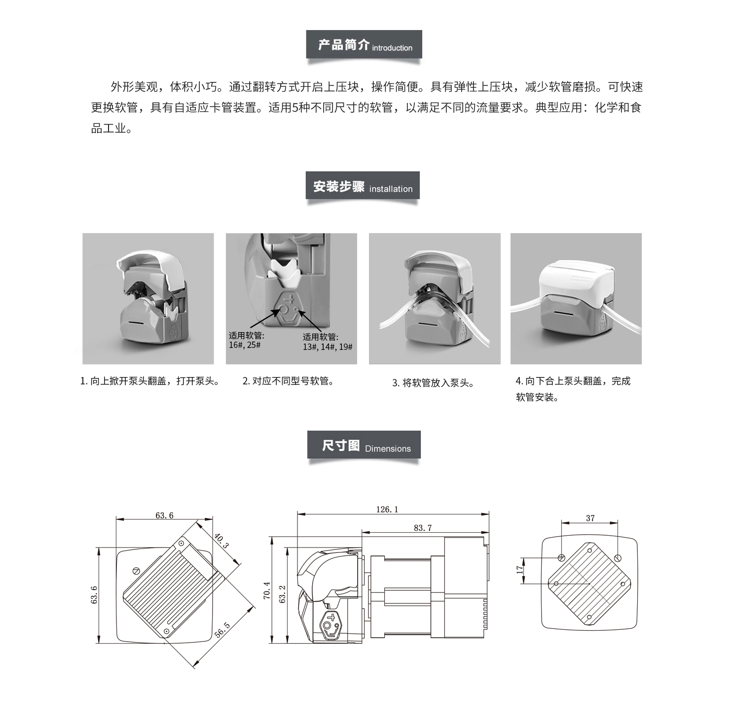 外形美觀,體積小巧。通過翻轉(zhuǎn)方式開啟上壓塊,操作簡便。具有彈性上壓塊,減少軟管磨損??煽焖俑鼡Q軟管,具有自適應卡管裝置。適用5種不同尺寸的軟管,以滿足不同的流量要求。
