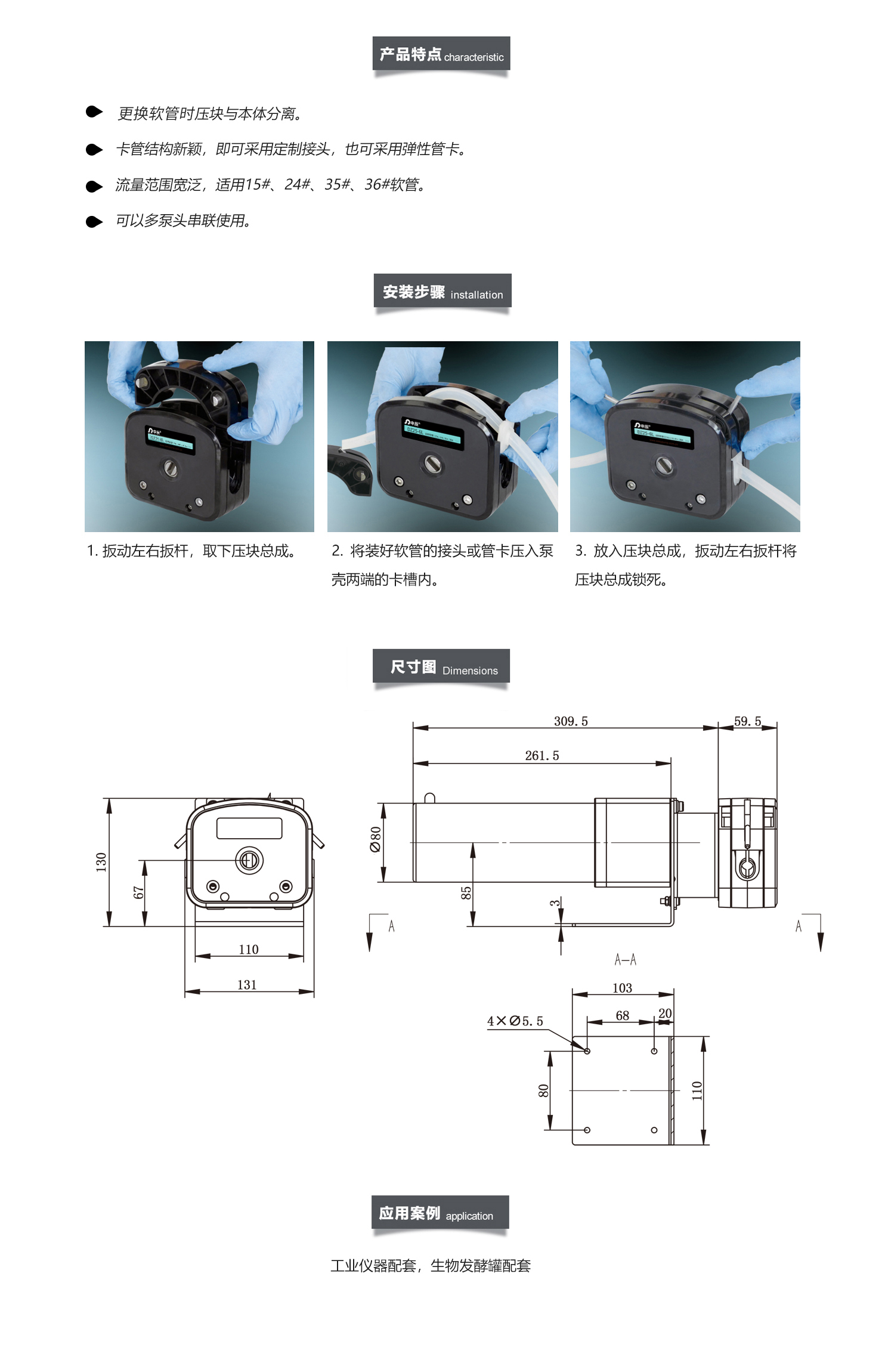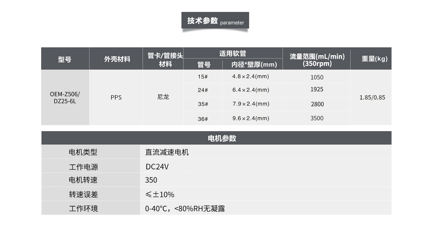 DZ系列蠕動泵泵頭搭配交流電機 泵頭殼體采用鋁合金或PPS聚苯硫醚材料 304不銹鋼滾輪總成 適用壁2.4mm的軟管 滿足0.2-6000mL/min的流量范圍 適用于液體粘度高 且含有顆粒 絮狀物或出口壓力大