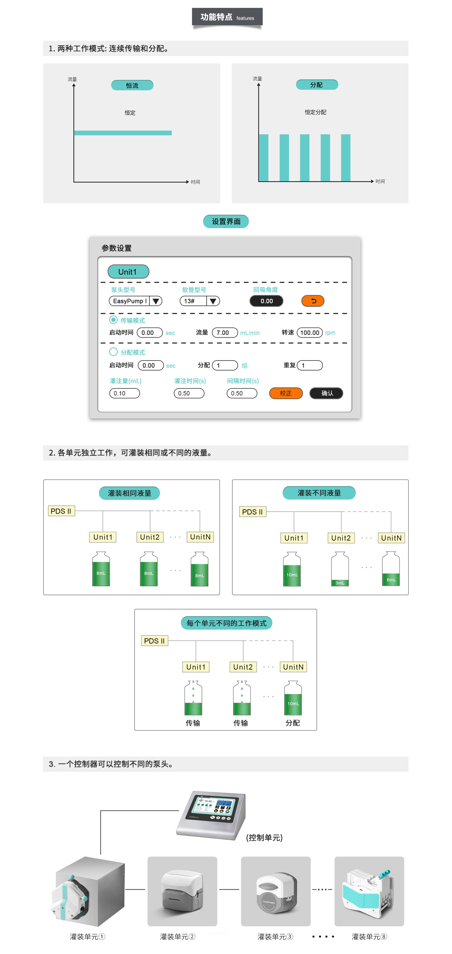 一個(gè)控制器可以控制8個(gè)泵單元。 支持傳輸和分配功能。 每個(gè)單元在相同或不同的參數(shù)下工作。