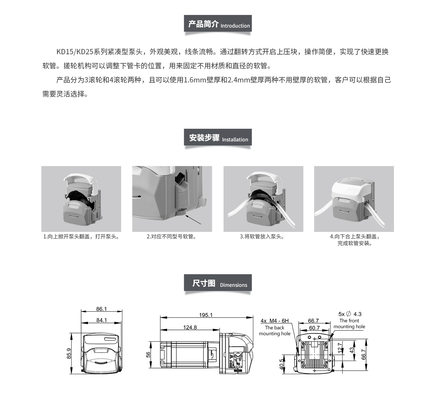 KD15/KD25系列緊湊型泵頭,外觀美觀,線條流暢。通過翻轉方式開啟上壓塊,操作簡便,實現了快速更換軟管。搓輪機構可以調整下管卡的位置,用來固定不用材質和直徑的軟管。產品分為3滾輪和4滾輪兩種,且可以使用1.6mm壁厚和2.4mm壁厚兩種不用壁厚的軟管,客戶可以根據自己需要靈活選擇。