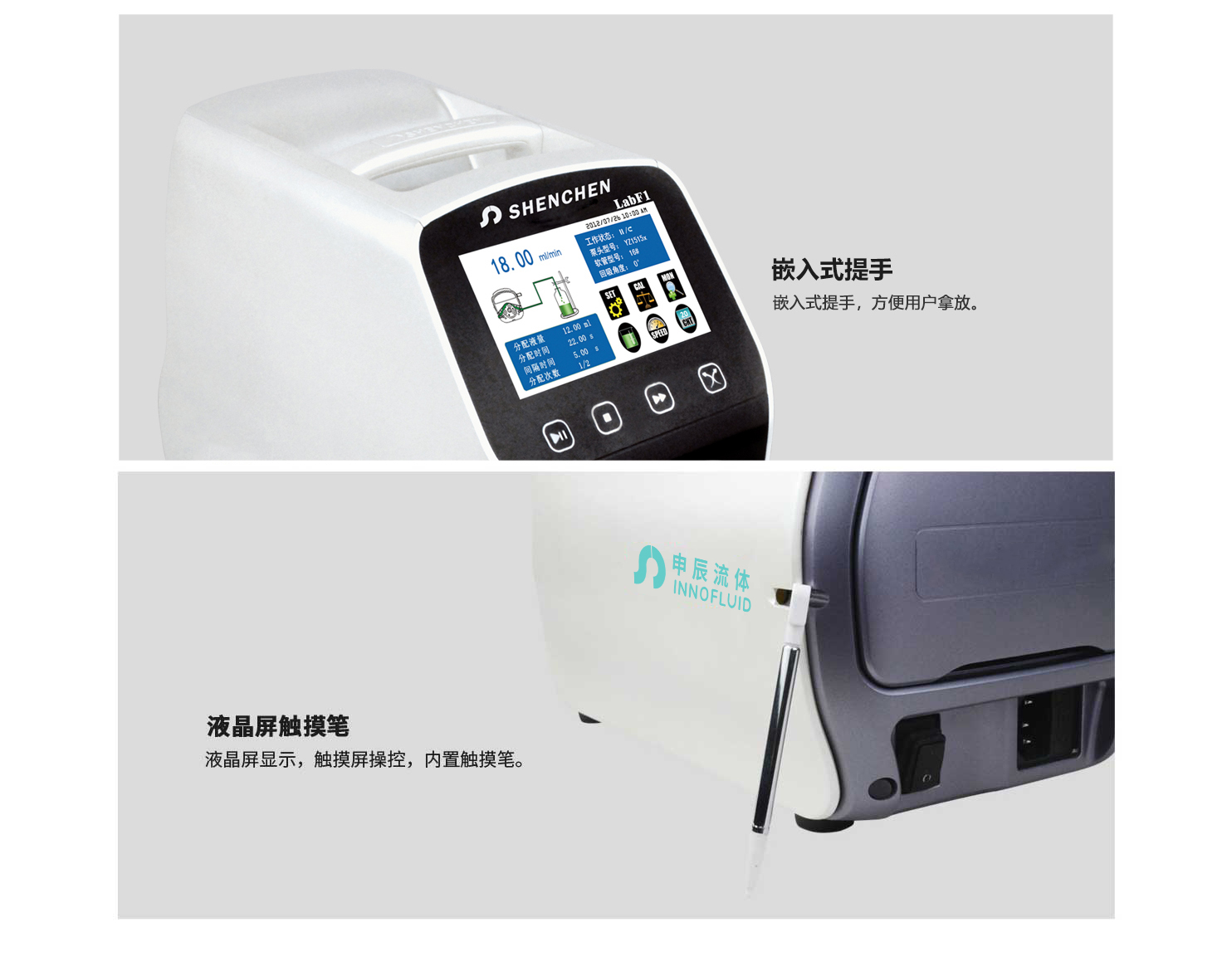 LabF1智能分裝蠕動(dòng)泵 智能版分配型蠕動(dòng)泵 采用ABS工程塑料外殼 流線形設(shè)計(jì) 采用4.3英寸彩色液晶屏顯示 觸摸屏操控 具有電機(jī)運(yùn)行狀態(tài)輸出信號(hào)